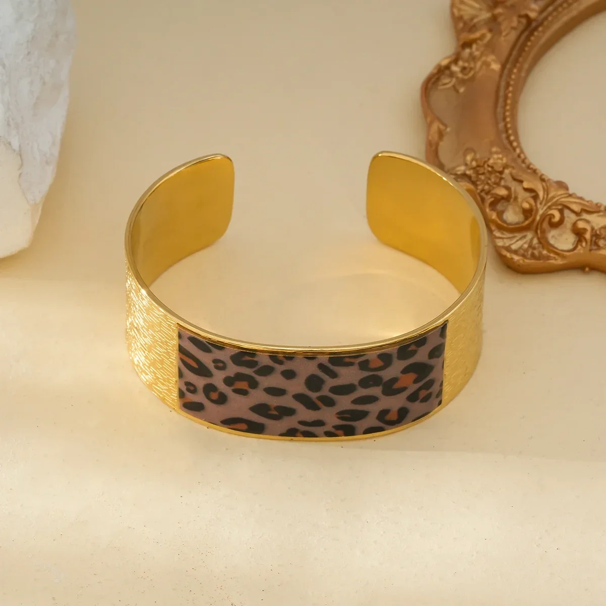 Bracelet Doré Manchette Ouverte Texturée Motif Léopard. Tous nos produits sont fabriqués en acier inoxydable, un matériel qui résiste à l'eau et au temps.