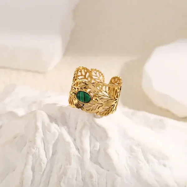 Bague Dorée Motif Feuilles Avec Pierre Ovale Malachite. Tous nos produits sont fabriqués en acier inoxydable, un matériel qui résiste à l'eau et au temps.