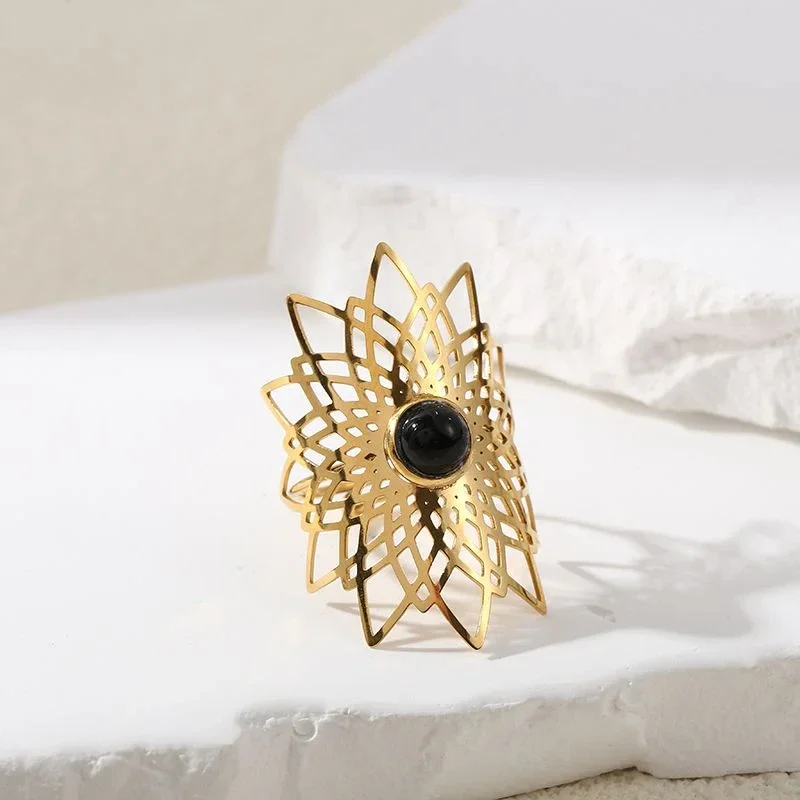 Bague Dorée Motif Fleurs Multicouches Avec Pierre Noire. Tous nos produits sont fabriqués en acier inoxydable, un matériel qui résiste à l'eau et au temps.